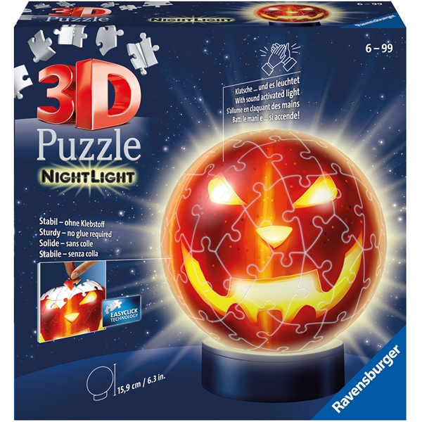 Puslespill 72 Deler 3D Puzzle-Ball Pumpkin Night Light er et fantastisk puslespill i 3D som også kan brukes som nattlys. Puslespillet inneholder 72 brikker som skal settes sammen for å lage det kule gresskaret. Det medfølgende stativet har en LED -belysning som skinner gjennom gresskarets øyne, nese og munn og skaper en koselig glød i rommet. Lyset har en knapp på baksiden og kan deretter slås på / av ved å klappe hendene.