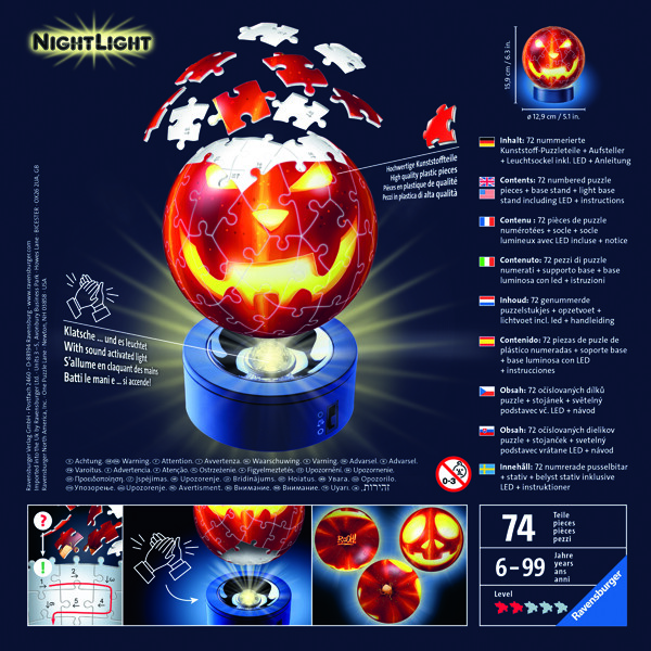 Puslespill 72 Deler 3D Puzzle-Ball Pumpkin Night Light er et fantastisk puslespill i 3D som også kan brukes som nattlys. Puslespillet inneholder 72 brikker som skal settes sammen for å lage det kule gresskaret. Det medfølgende stativet har en LED -belysning som skinner gjennom gresskarets øyne, nese og munn og skaper en koselig glød i rommet. Lyset har en knapp på baksiden og kan deretter slås på / av ved å klappe hendene.