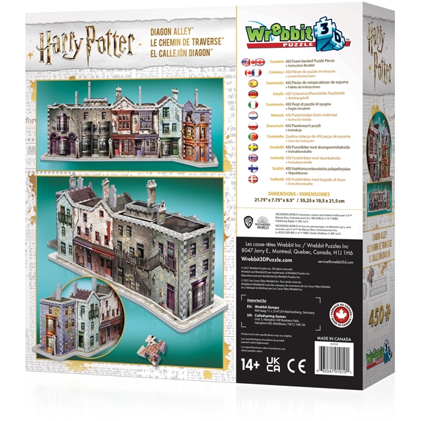 Et kult Harry Potter 3D-puslespill fra Wrebbit som kommer til å bli Diagongaten. Puslespillet har 450 deler som er laget i tynn kartong med bakside av skumplast og er 6 mm tykke.
