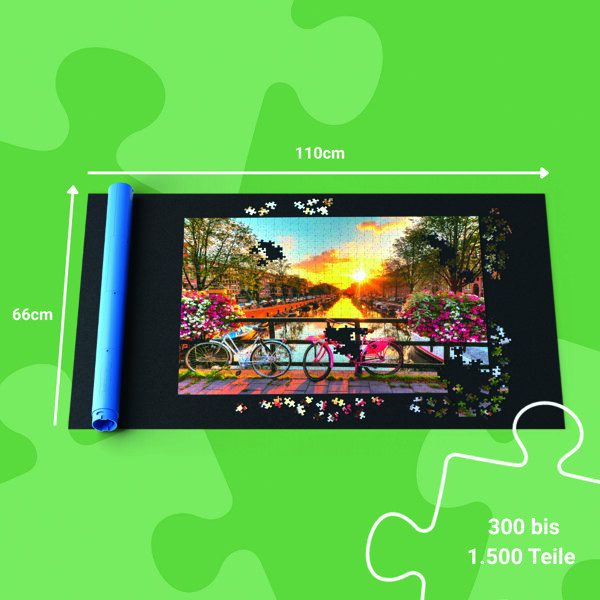 Ravensburger Puslespillmatte er ca 110 x 66 cm, og passer for puslespill på opp til 3000 biter.