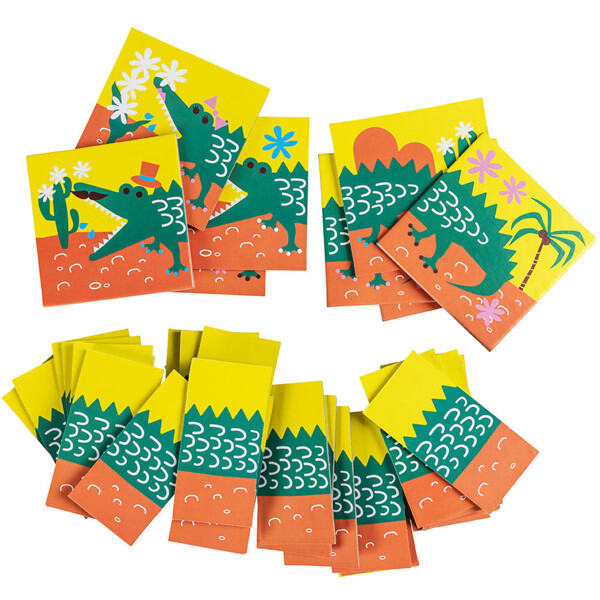 Hver spiller har en krokodille som de mater med dyrebrikker. På sin tur kaster spilleren den illustrerte terningen og prøver å finne en dyrebrikke som matcher kategorien. Med god hukommelse og litt flaks vil krokodillen din vokse seg lengre og lengre! Når dyrebrikkene er slutt, sammenlignes lengden på krokodillene, og den lengste krokodillen vinner!