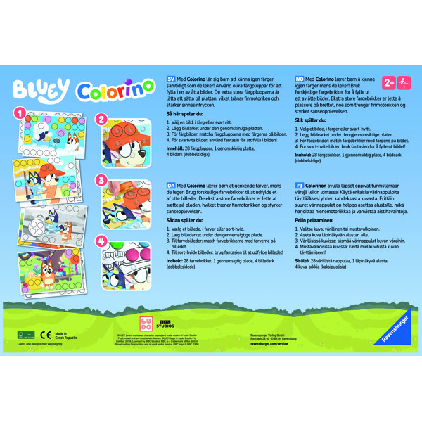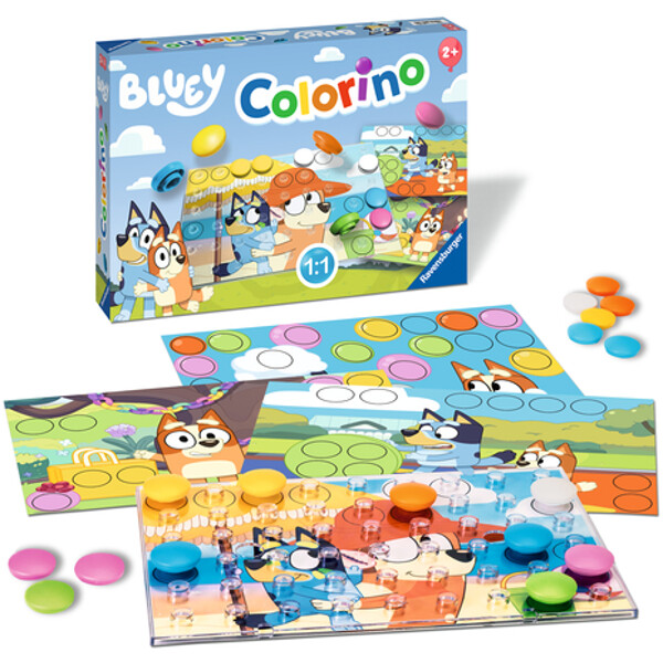 Velg et bilde fra Bluey, legg det under spillbrettet og sett de store fargepluggene på riktig plass. Rød på rød, blå på blå! Med Colorino lærer små barn farger, trener finmotorikk og har det gøy samtidig.