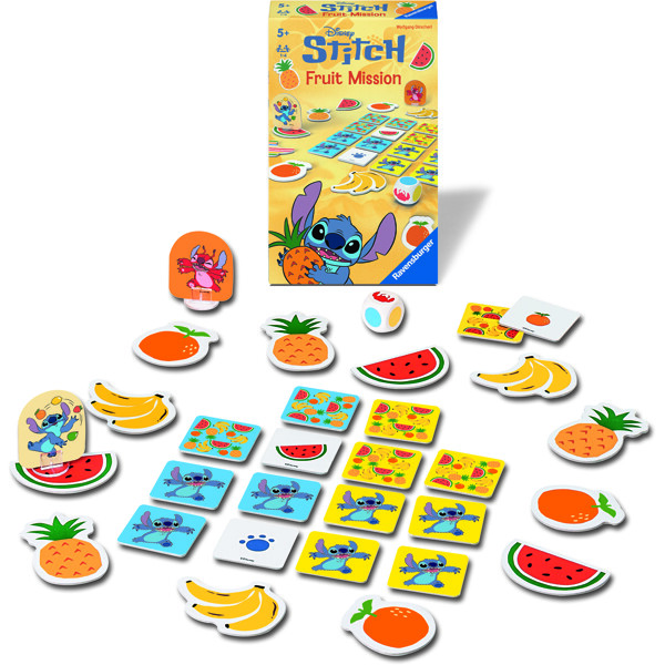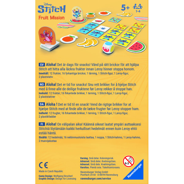 Inneholder: 12 frukter, 16 firkantede brikker, 1 terning, 1 Stitch-figur, 1 Leroy-figur, 2 plaststativer.