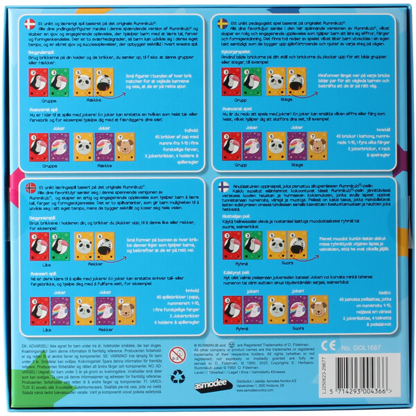 Et unikt pedagogisk spill basert på originalen Rummikub. Alle dine favorittdyr samles i denne spennende versjonen av Rummikub, som skaper en morsom og engasjerende opplevelse som hjelper barn å lære seg tall, farger og formgjenkjenning. Det finnes to nivåer av spillet som lar barn utvikle seg i sitt eget tempo samtidig som de bygger opp selvtillit og nyter hvert steg på veien.