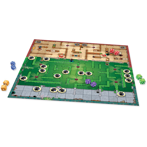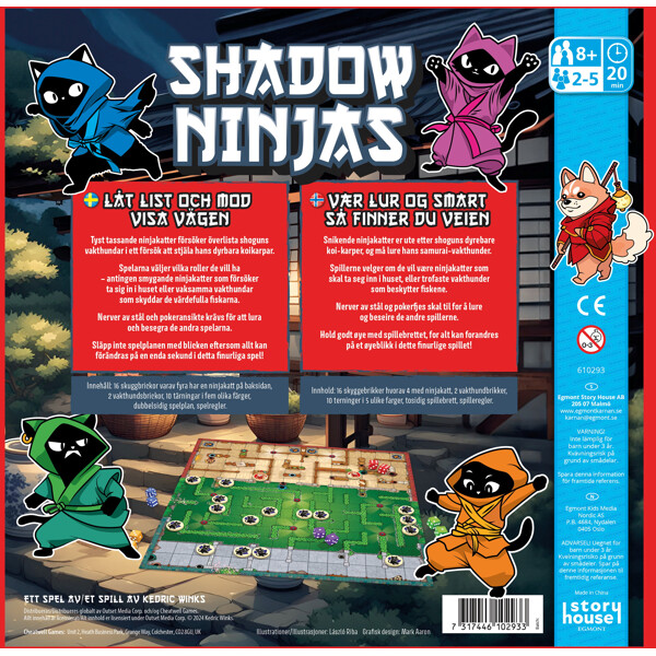 Innhold: 16 skyggebrikker hvorav fire har en ninjakatt på baksiden, 2 vakthundbrikker, 10 terninger i fem forskjellige farger, dobbeltsidig spillbrett og spilleregler.