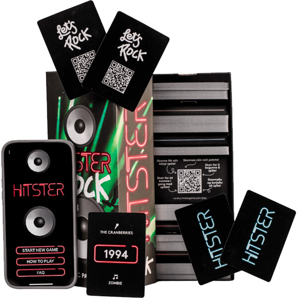 Hitster Rock med over 300 rocklåter fra ulike årstall. Plasser rockhits i riktig rekkefølge på tidslinjen din!Hitster er det perfekte partyspillet der du skal bygge en tidslinje med over 70 år av hits. Lytt til gamle og nye hits og ta tur med å legge dem i kronologisk rekkefølge på tidslinjen din. Den spilleren som først samler 10 hits vinner! Du trenger ikke å vite nøyaktig hvilket år låten ble utgitt, bare kunne plassere låten i riktig forhold til de andre.Frittstående spill. Du trenger ikke å ha det første spillet for å kunne spille dette, det fungerer som et eget spill eller du kan bygge på ditt andre med ekstra låter.Et familie-/partyspill med enkle regler og masse herlig musikk!Innhold: 300 kort med musikkhits og 30 hitsterkort for å øke sjansene dine for å vinne.Spillet krever en mobiltelefon med musikkstreamingtjeneste (ikke inkludert). Skann kortene med Hitster-appen så spiller Spotify dem automatisk.Regelspråk (nordisk): Svensk, finsk, dansk, islandsk og norsk.Antall spillere: 2-10Spilletid: ca. 30-60 min