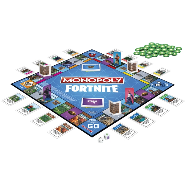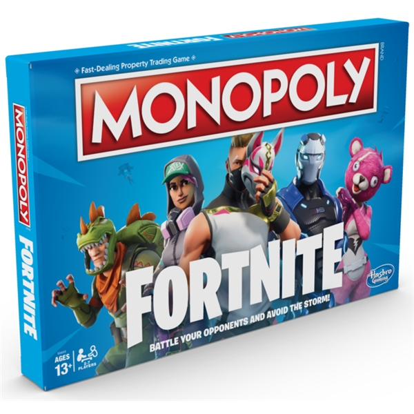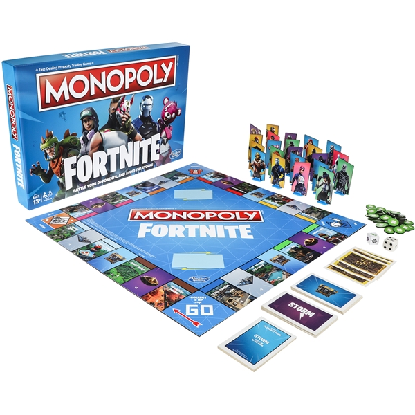Monopol Fortnite med et engelsk regelverk.I denne spennende versjonen av Monopol, skal spillerne ta over områder, sloss mot sine motstandere og forsøke unngå The Storm for å overleve. Spilleplanen, designet og alle deler som er inkludert er inspirert av TV-spillet Fortnite. Spillet inkluderer Fortnites områder og loot chest cards. I stedet for at som i det klassiske Monopol der du tjener monopolpenger tjener du i stedet HP. Velg karakter, velg mellom 27 heftige outfits. Nå er det på tide å spille. Spillerne får plukke opp health packs, bygge murer og skade sine motstandere. Vær gang en spiller passerer slipper de løs The Storm, unngå den eller tap HP. Akkurat som i TV-spillet, siste spilleren som overlever vinner! Regelverk: Engelsk.