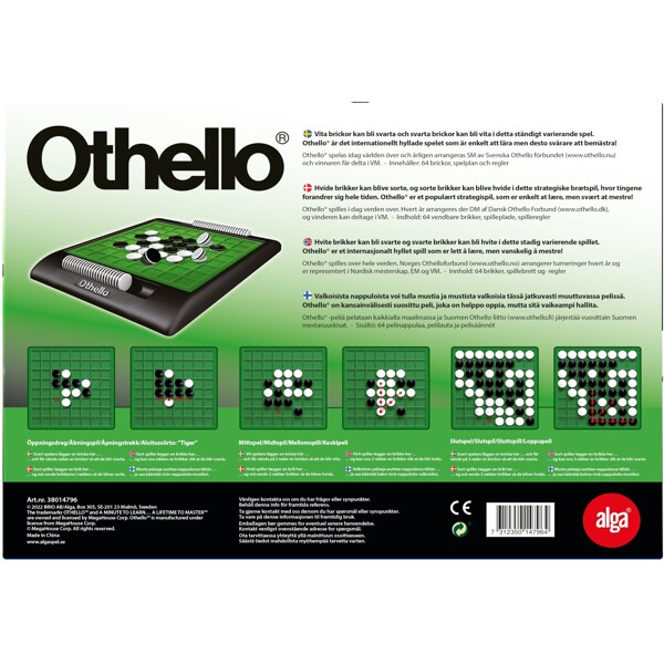 Original Othello er en stor favoritt blant unge strategispillere i dag! Spillet er lett å forstå, men tar en livstid å mestre! Othello spilles over hele verden, og det spilles til og med VM i Othello hvert år siden 1977! Othello handler om å samle flest mulige brikker av fargen sin ved å fange motstanderens brikker mellom to av sine egne. Regler og tekst på svensk, dansk og finsk.