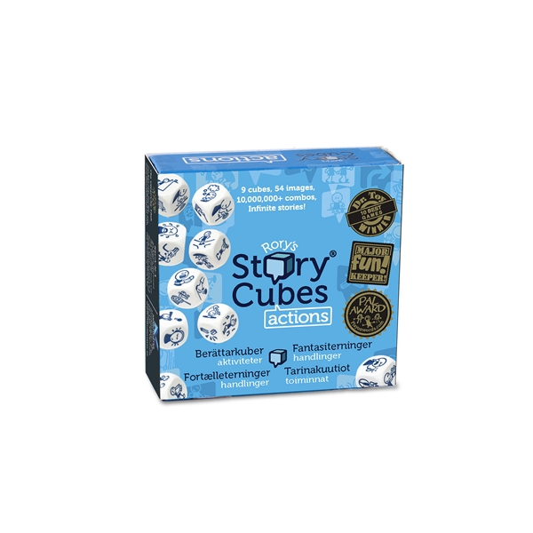...et fantastisk nytt spill, eller leke, eller... Rory's Story Cubes er en liten historieskapere med stor dybde som setter igang fantasien hos spillere i alle aldre.Målet er å fortelle en historie som vever inn alle ni bilder som vises på kubene, bare fantasien setter grenser og alle svar er riktige! Regn med en kreativ, utviklende fantastisk morsom og overraskende stund uansett om dere spiller med venner, barn, voksne eller alene. Story Cubes er et spill der alle er vinnere! Rory's Story Cubes Actions er en variant av originalvarianten av Rory’s Story Cubes, fyllt av aktivitet! Bildene forestiller handlinger og kan brukes på egen hånd eller hvorfor ikke sammen med originalkubene?