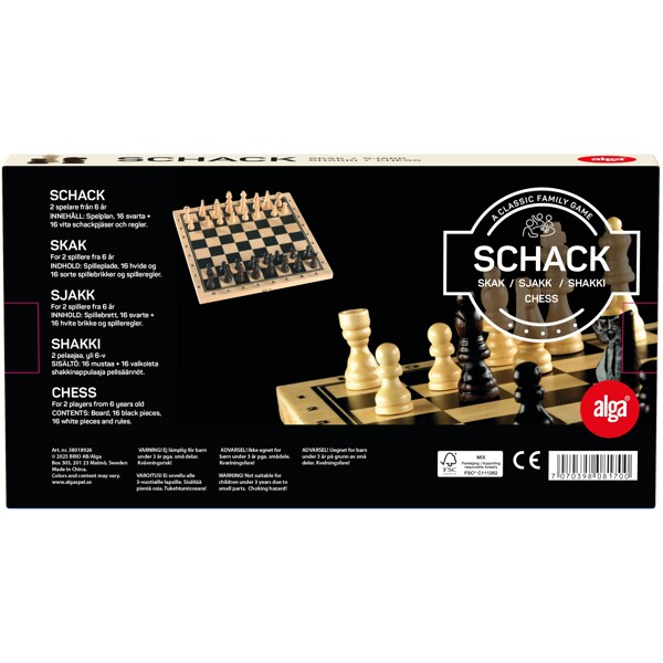 Det klassiske strategispillet for to spillere. Her med fin treeske der du kan oppbevare sjakkbrikkene og regelheftet! Når du vil spille, felles esken ut og blir et spillebrett! Inneholder: 1 Brett 32 Sjakkbrikker Regelhefte