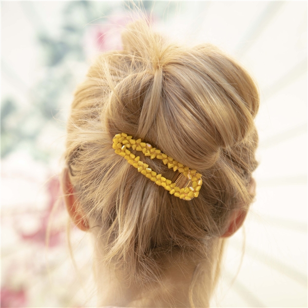 PEARLS FOR GIRLS Happy Clip Yellow er en hårspenn med gule glassperler. Hårspennet er et fint hårtilbehør og passer like bra til hverdagen som til fest. Hårklippet er 8 cm langt og metallet er gullbelagt.