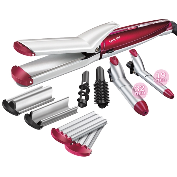 Multistyler med flere forskjellige valg av styling: krøllejern for doble krøller, bølger, rettetang, krølltang og krøller i forskjellige størrelser (19 eller 32 mm), børste (16 mm ) eller spiralformet (16 mm)