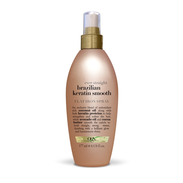 Brazilian Keratin Flat Iron Spray fra OGX er en varmebeskyttende spray med naturens beste beskyttelse: fyldig brasiliansk kokosolje med fuktighetsgivende keratin.