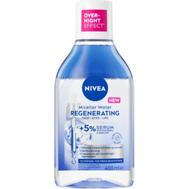 Nivea Micellar Water Regenerating er et micellarvann med +5% serum for trett og sensitiv hud som effektivt fjerner vannfast sminke, urenheter og smuss med bare noen få fjærlette strøk. Det gjenoppretter fuktbalansen og fornyelsen av huden om natten, for en hud som ser uthvilt ut om morgenen!