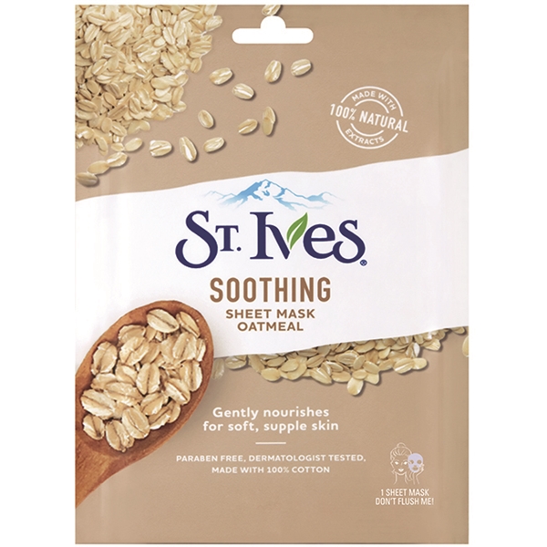 St. Ives Soothing Sheet Mask Oatmeal er en skånsom og avslappende ansiktsmaske for hjemmespaet som beroliger og fukter huden.