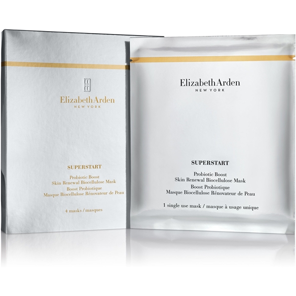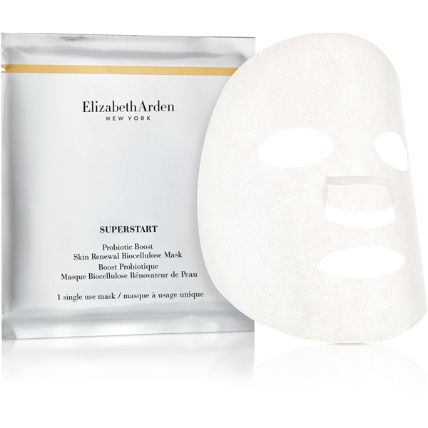 Superstart Probiotic Boost Biocellulose Mask fra Elizabeth Arden er en arkmaske som styrker hudens naturlige forsvar og motstand. Den luksuriøse masken gir huden en konsentrert formel som optimaliserer hudens naturlige fornyelsesprosess. Resultatet er en strålende, smidig og sunn hud etter bare en behandling. Andre arkmasker kan oppløses i ansiktet og bli klissete, men denne masken er laget av 100 prosent fermentert kokosnøttvann. De superfine fibrene (omtrent 1000 ganger tynnere enn en hårstreng) får masken til å krype nær ansiktskonturene og føles som en annen hud.