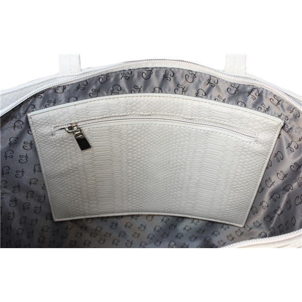 BESKRIVELSE / DETAILS Farge : lys grå Ytre materiale: PU (polyuretan) vegansk skinn Fôr: 100% polyester Glidelåsavtrekker og metallmerke med logo i skinnende sølv Glidelås er grå med elementer av sølv posen rengjøres med lunkent vann og såpe (motstandsdyktig, ikke maskinvaskbar)