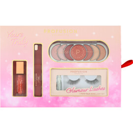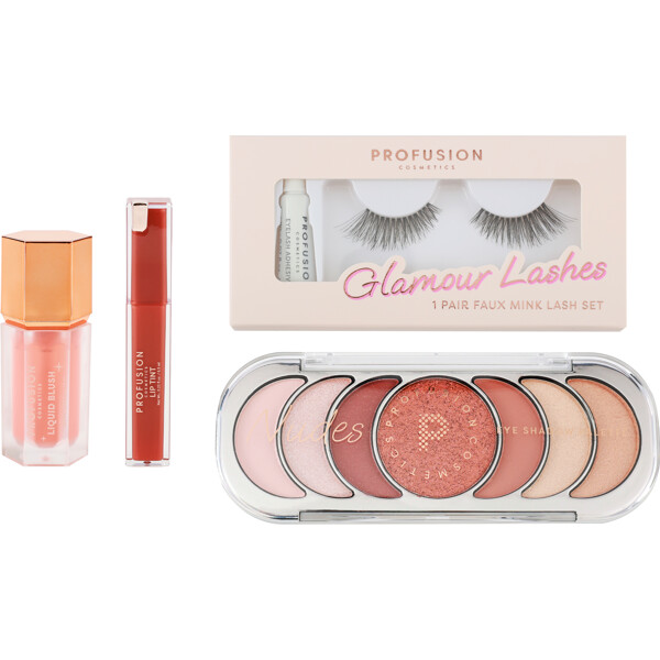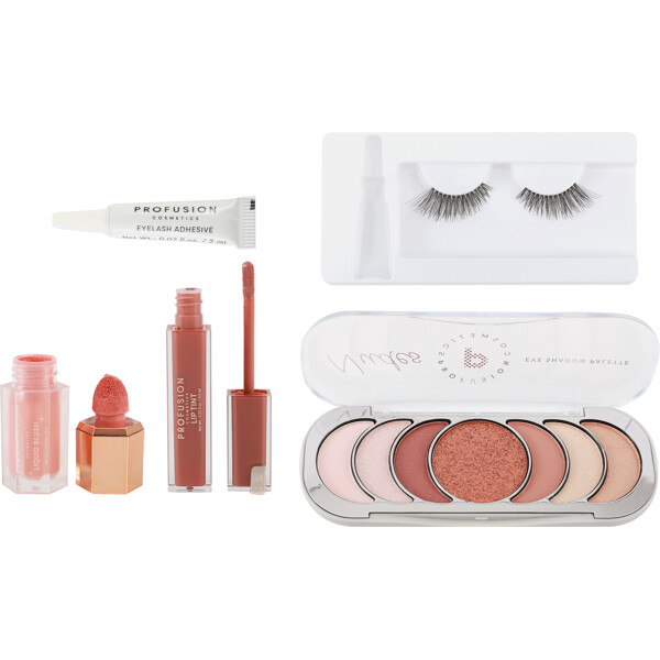 Det inneholder en flytende rouge for naturlig farge, en fuktighetsgivende lip tint med lett farge og glans, en øyenskyggepalett med 4 nyanser for alt fra diskrete hverdagslooker til intense kveldsmakeup, samt et par løsvipper med transparent lim for enkel påføring.