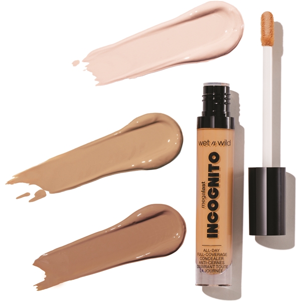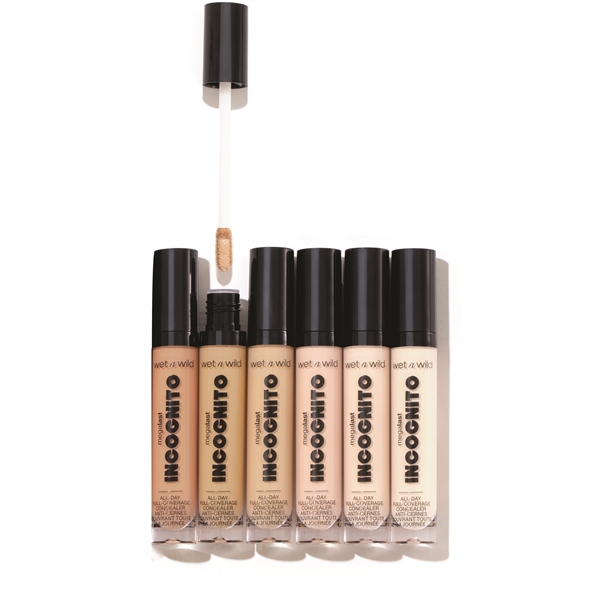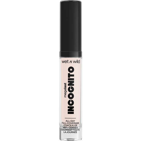 MegaLast Incognito Full Coverage Concealer fra wet n wild er beriket med nærende og fuktighetsgivende ingredienser som sheasmør, lakrisrotekstrakt og mangofrøsmør. Den er langvarig og byggbar med middels til full dekning og gir en matt finish.