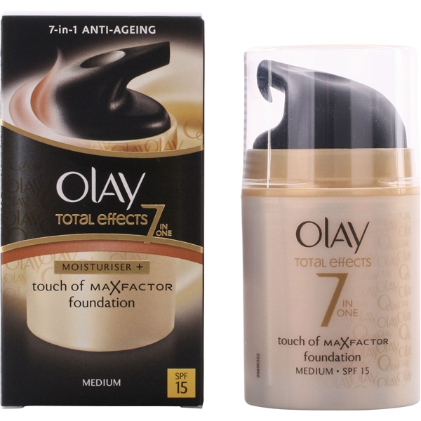 Olay Total Effects Touch of Foundation er en farget dagkrem som kombinerer Total Effects anti-ageing creme med pigment fra Max Factor foundations for å glatte ut hudtonen. Max Factors foundationpigment gir en balanse i farge og dekning og gir huden en transparent og naturlig finish. Inneholder SPF15. Finns i 2 nyanser, fair og medium. Total Effects har 7 anti-age effekter i en pumpe og er fremtatt for kvinner som vil ha en multi-funksjonell anti-ageing serie som gir mer enn bare fukt. Total Effects arbeider mot 7 alderstegn: 1. Forbedrer grå og trøtt hud slik at den får en herlig friskhet og glans. 2. Jevner ut hudtonen, noe som gir en bedre balansert farge samt at huden ser yngre ut. 3. Mykgjør tørr hud. 4. Bevarer hudens naturlige fukt for et fastere utseende. 5. Forminsker synligheten av fine linjer og rynker. 6. Minimerer synligheten av store porer. 7. Reduserer synlige misfarginger i huden og pigmentflekker.