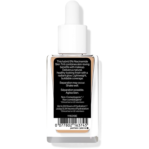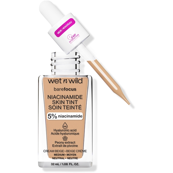Bare Focus Niacinamide Skin Tint fra Wet n Wild er en medium dekkende foundation med pleiende ingredienser. Få en sunn glød på et øyeblikk med hjelp av denne lette foundationen som inneholder niacinamid, en ingrediens kjent for å lysne opp. Den er byggbar og er beriket med en luksuriøs blanding av niacinamid, hyaluronsyre, pionekstrakt og vitamin E.