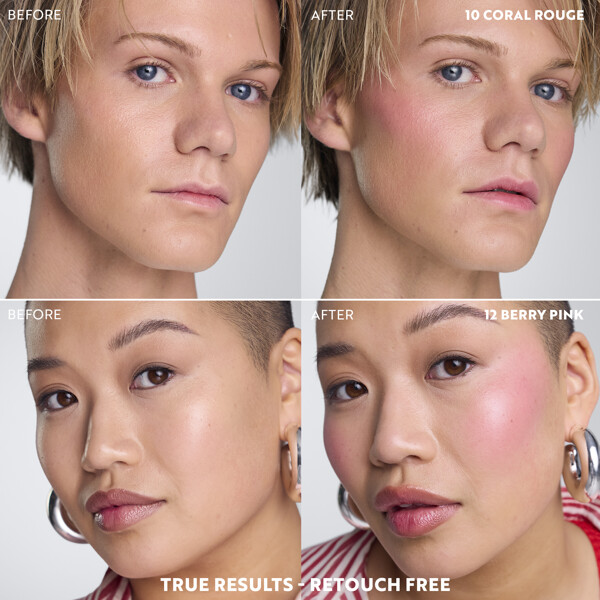 Påfør med en duttende bevegelse direkte på kinn og lepper, og bland deretter ut med fingertuppene, en svamp eller børste for en sømløs look. Behold alltid plastlinsen på for å opprettholde produktets ytelse og fargegjengivelse.