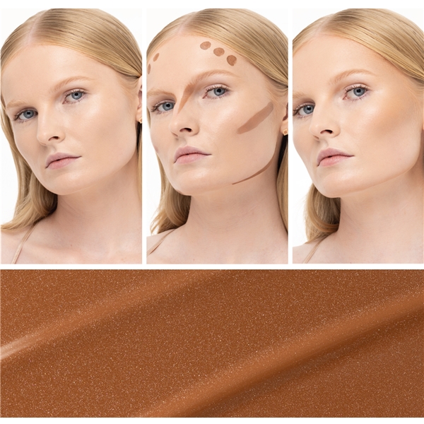 Den myke og kremete teksturen smelter ved kontakt med huden og gir en forfriskende glød som aldri før! Puteapplikatoren fordeler produktet jevnt for å definere ansiktstrekkene og blandes lett ut for en naturlig contour-finish.