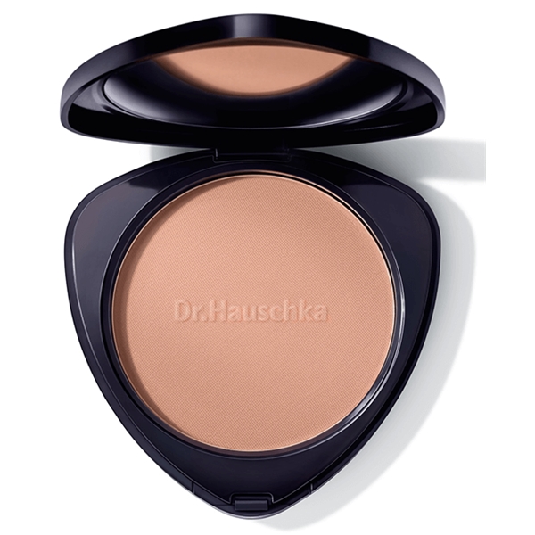 Bad pulveret på pannen, på nesen, haken og kinnene. Stryk deretter forsiktig utover med oppadgående bevegelser.