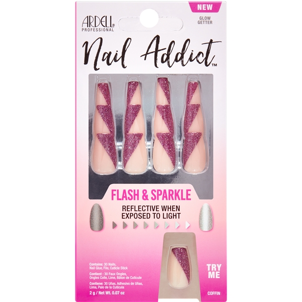 Ardell's Nail Addict Flash & Sparkle falske negler har en iriserende skimmereffekt. En innovativ reflekterende glitterteknologi får neglene til å skinne og gnistre i forskjellige typer lys. Effekten aktiveres av kamerablits, LED/UV og discolys. La neglene skinne!