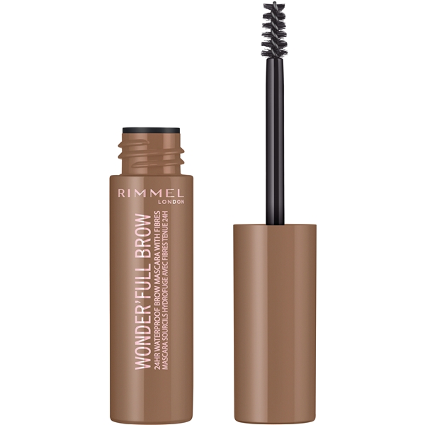 Rimmel Wonderfull Brow Mascara 24 H er en øyebrynsmaskara som gir definerte og fyldigere bryn. Formelen er beriket med fibre som gjør brynene fyldigere og oljer som pleier og styrker hårstråene.