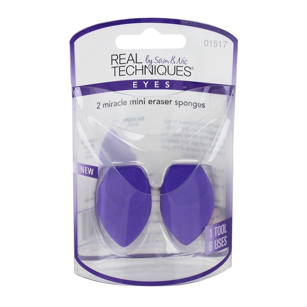 Real Techniques Miracle Mini Eraser Sponge har 4-i-1 bruksområder. Ta bort dryssende mascara eller øyenskygge som har havnet feil med Miracle Mini Eraser Sponge, som lett suger opp sminkerester. Tynn flat kant for å ta bort sminke på kantene rundt øyenbrynene og nesen. Bredere flat kant for å ta bort sminke under øynene.Runde sider for å korrigere sminke på kinnbein, panne og hake. Presisjonsspiss for å dra rundt kantene av øynene.