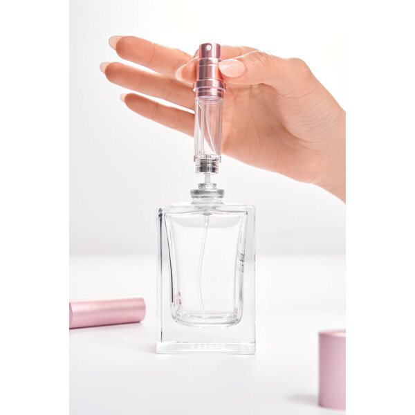 Ta av spraykorken fra din favorittparfyme og plasser bunnen av atomiseren over parfymeåpningen. Pump opp og ned til flasken er fylt. Sett deretter på lokket – nå er din atomiser klar til bruk. Spray når du vil friske opp med din signaturduft!