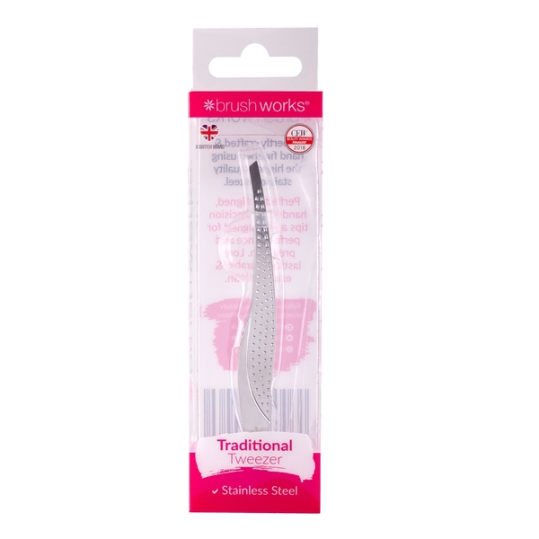 Brushworks Traditional Tweezers er laget av slitesterkt rustfritt stål. Den har en skrå spiss og en buet form som gir et stabilt og behagelig grep under bruk slik at du får best mulig resultat.