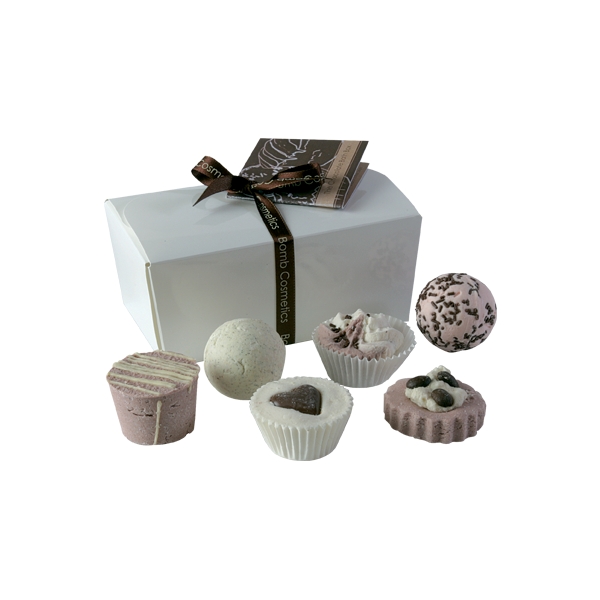 Chocolate Ballotin Gift Pack fra Bomb Cosmetics er en herlig sjokoladeeske med badebomber. Frosse i herlige «sjokoladebad» med Bomb Cosmetics fantastiske badeprodukter. De er håndlagede og fuktighetsgivende med kakaosmør og sheasmør.