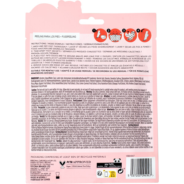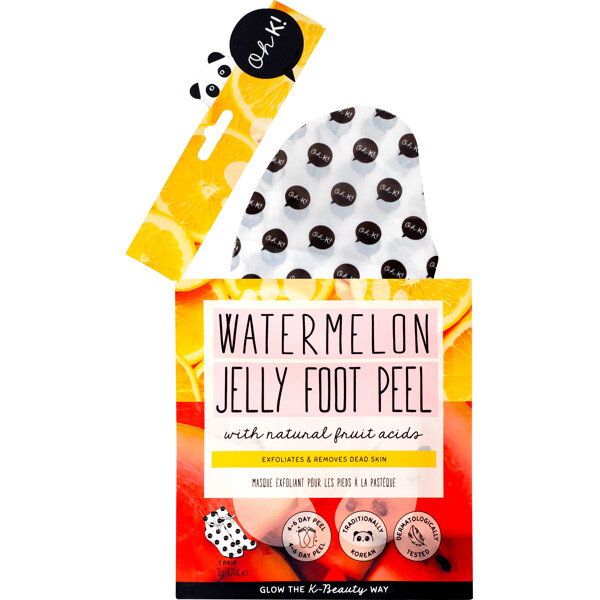 Oh K! Watermelon Jelly Foot Peel er en eksfolierende fotmaske som inneholder fruktsyrer (AHAer & BHAer) som skånsomt eksfolierer huden og fjerner døde hudceller.