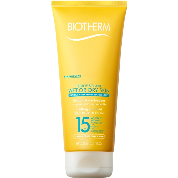 SPF 15 Fluide Solaire Wet or Dry fra Biotherm er en solkrem med SPF15 som kan brukes til både ansikt og kropp. For hele familien og passer alle hudtyper. Beskytter effektivt mot solen (UVA & UVB) samtidig som den gjenfukter huden.Kan brukes på både våt og tørr hud. Formelen tas raskt opp av huden uten å legge noen hvite merker. Inneholder duftnoter av sitrusekstrakt.