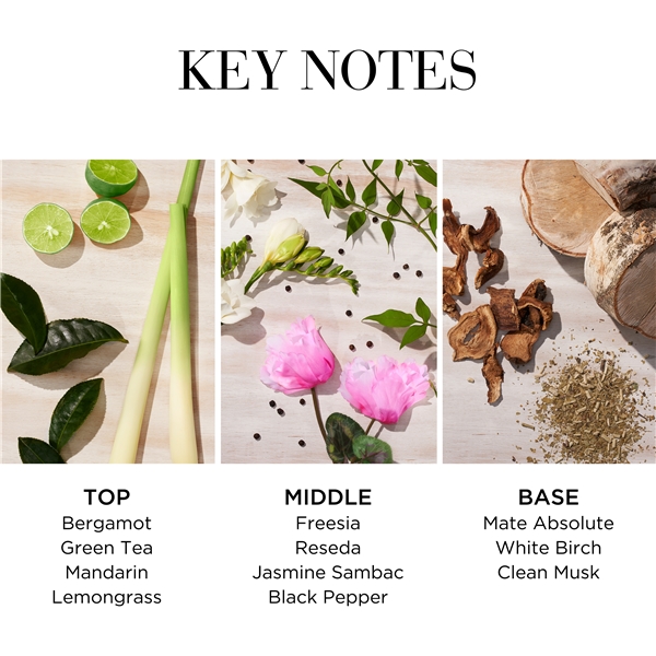 Duften åpner med florale toppnoter av fresia, sjasminsambac og forfriskende bergamott. essens. Den lette blomsterharmonien kontrasteres av mate absolutt, hvit bjørk og musk, og skaper en beroligende balanse mellom friskhet og krydret.