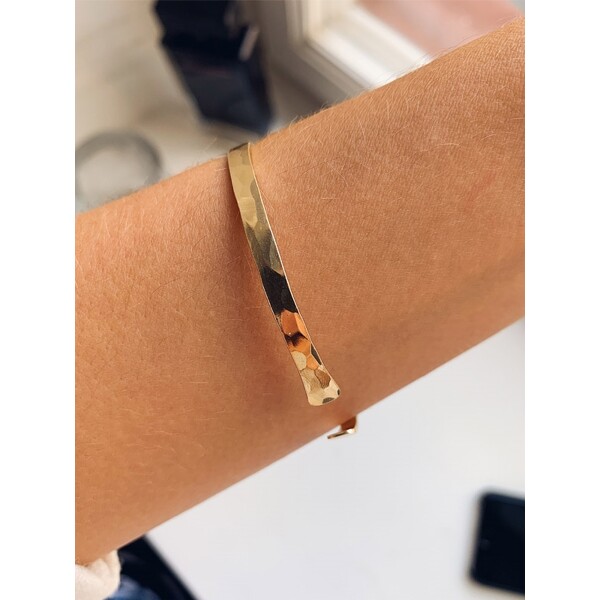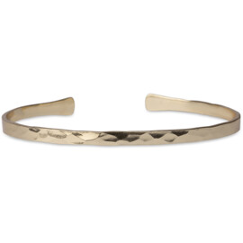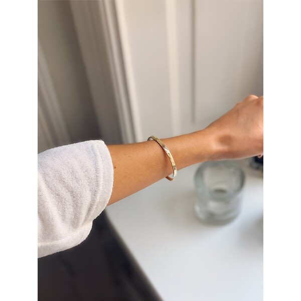 Et gullbelagt håndlaget hardt armbånd som er håndhamret for å få et fint mønster på oversiden. Armbåndet kan bøyes til slik at det passer deg perfekt.