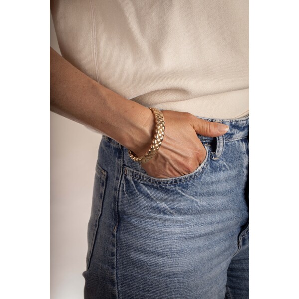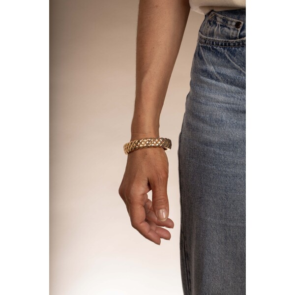 Et elastisk armbånd i metall med gullbelegg. Armbåndet har et fint mønster som føles luksuriøst og moderne.