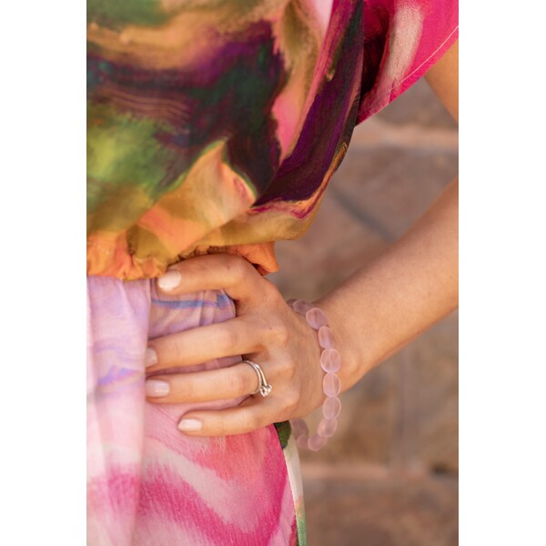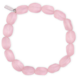 Et elastisk armbånd med rosa glassperler som er matte i slipingen og har en myk avrundet uregelmessig form.