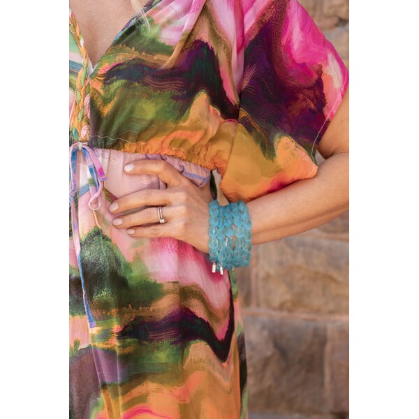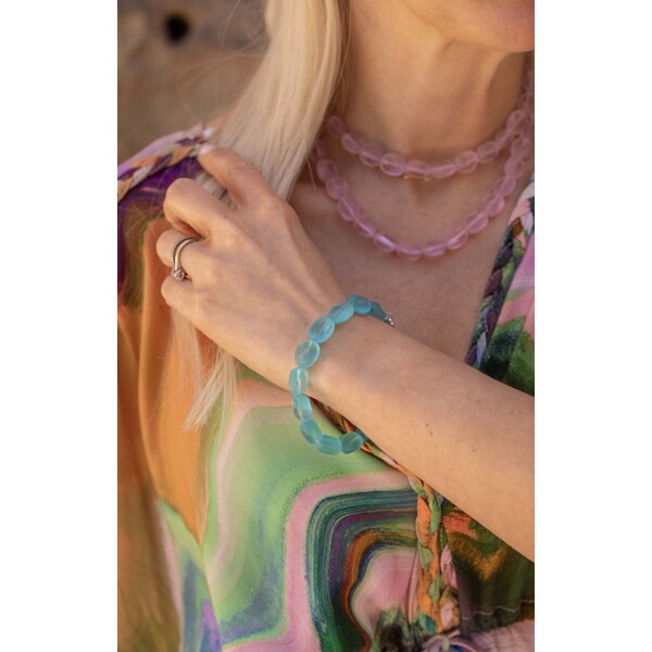 Et elastisk armbånd med turkise glassperler som er matte i slipingen og har en myk avrundet uregelmessig form.