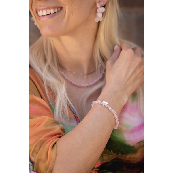 Et fint elastisk armbånd med rosa små rosenkvartssteiner. Rosenkvartsen sies å gi kjærlighetsenergi og en følelse av velvære. Den kan både tiltrekke seg kjærlighet, styrke kjærligheten og lindre kjærlighetssorg. Den sies også å lindre og dempe stress.