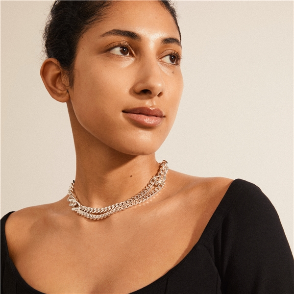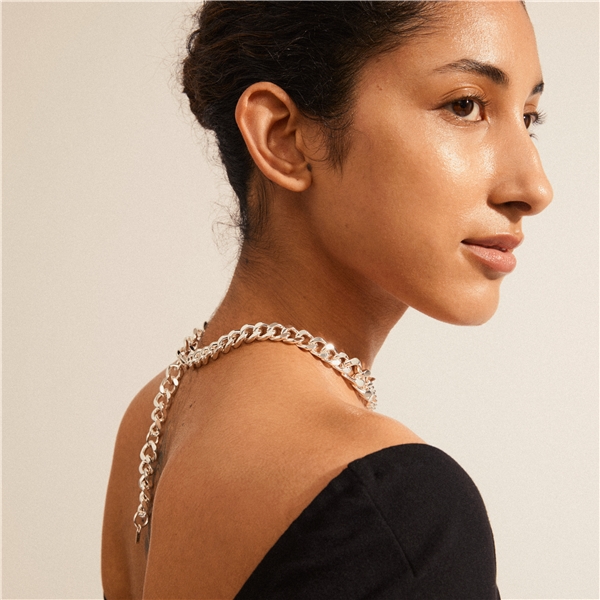 Gjør hver dag til et eventyr. Begi deg ut i nye eventyr med Pilgrims sølvbelagte lenke fra Friends-kolleksjonen. Den asymmetriske bredden på kjeden har et ultrakjølig industrielt uttrykk som fremheves av den monokrome stilen og den tykke følelsen i designet. Gå vinteren i møte med et kult uttrykk og bruk kjeden veldig kort tett inntil halsen, som en lengre kjede eller som en trendy Y-kjede. Velg etter din egen smak!