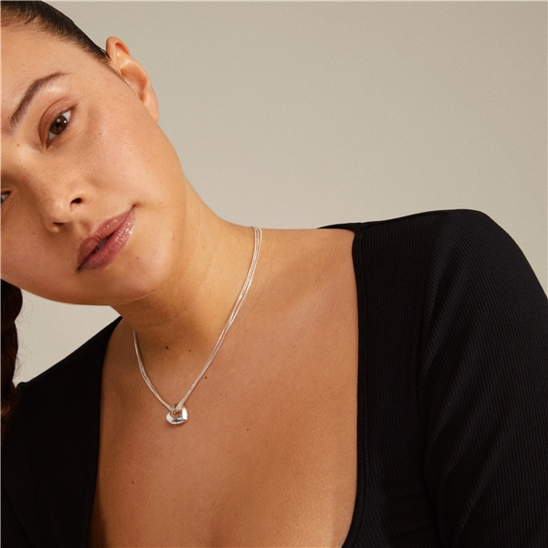 Følg hjertet ditt! Halskjede fra Pilgrims Wave-serien med sølvbelagte bokskjeder og hjerteanheng. De mange kjedene gir et trendy lag-på-lag-utseende og det chunky hjertet gir antrekket ditt et stilig og stilig element. Style kjeden med eller uten anheng avhengig av anledningen. Halskjedet er 40 cm + 9 cm forlengelseskjede og er laget av min. 75 % resirkulert materiale.