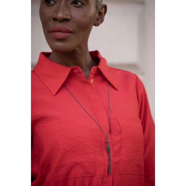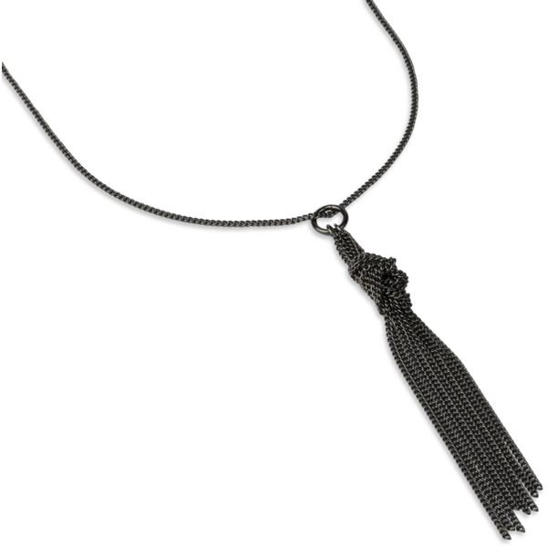Gun metal belagt halskjede med en dusk som består av mange små kjeder med en knute øverst.