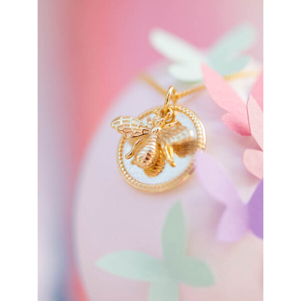 18K gullbelagt 925 sølvhalskjede. Anhenget består av en flat berlock og en støpt detaljert bie som henger foran.