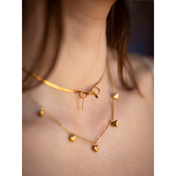 Et lite halskjede med en sløyfe som sitter litt på siden av kjedet. Kjedet er en flat slangekjede som er 2 mm bred. Halskjedet er i rustfritt stål med gullbelegg.