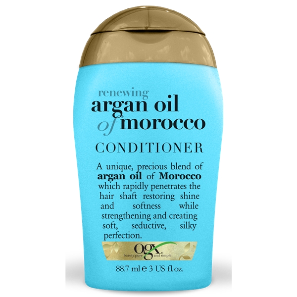 Reisestørrelse av Argan Oil Conditioner fra OGX som har en verdifull kombinasjon av arganolje som gjenoppretter og styrker håret til silkeaktig perfeksjon. Den beskytter dessuten håret mot varmestyling og UV-skader.